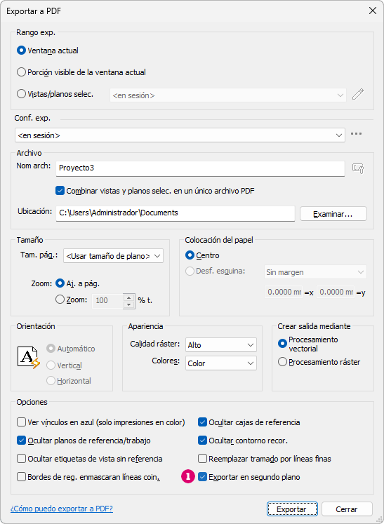 La exportación a PDF se puede ejecutar en segundo plano. Puede seguir trabajando en el modelo mientras se ejecuta el proceso de exportación de PDF.