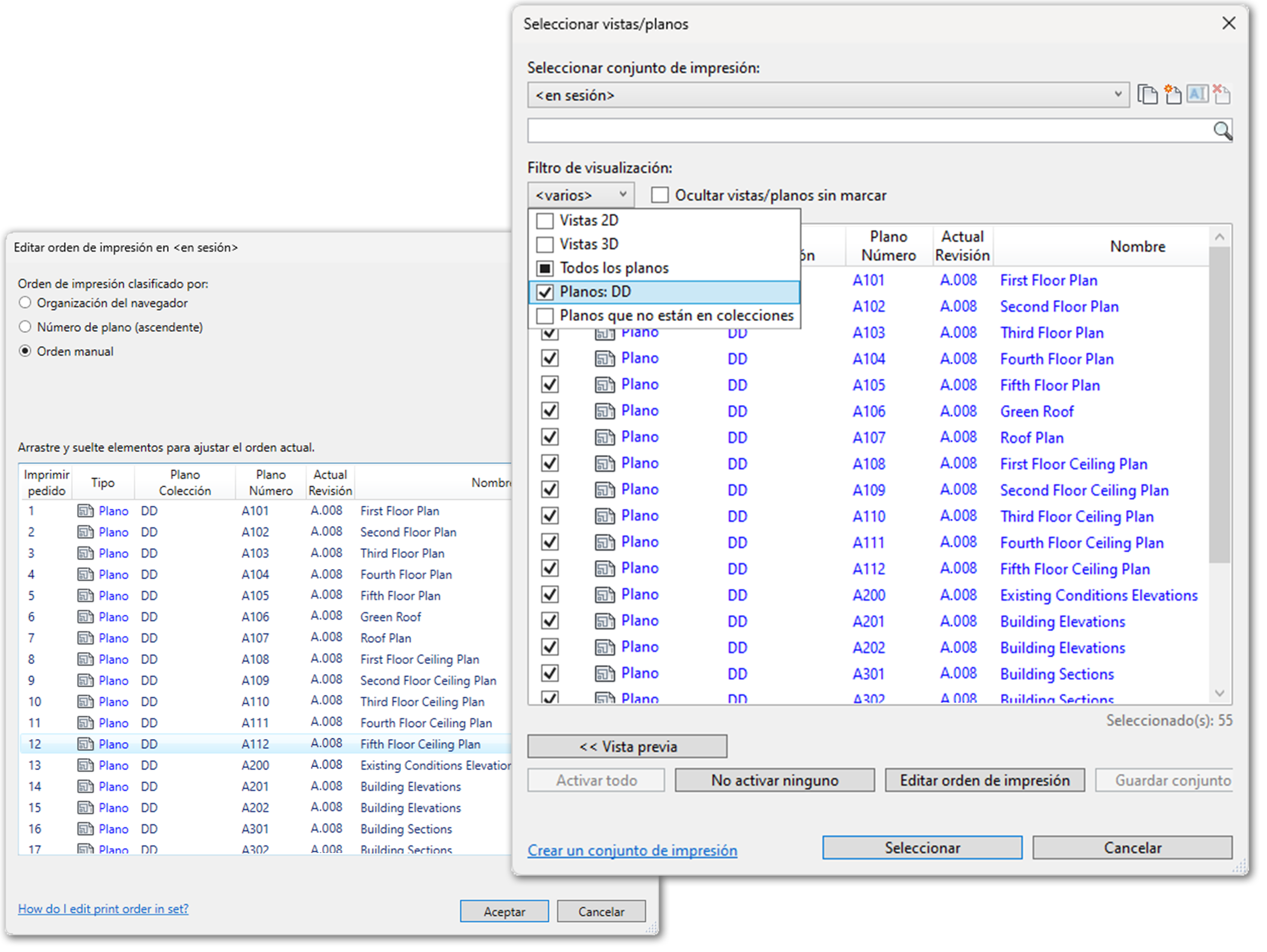 La selección de planos y vistas es más sencilla gracias a las columnas adicionales de colección de planos, número de plano y revisión actual incluidas en el cuadro de diálogo. Se han mejorado las exportaciones a PDF para que sean más rápidas y precisas.