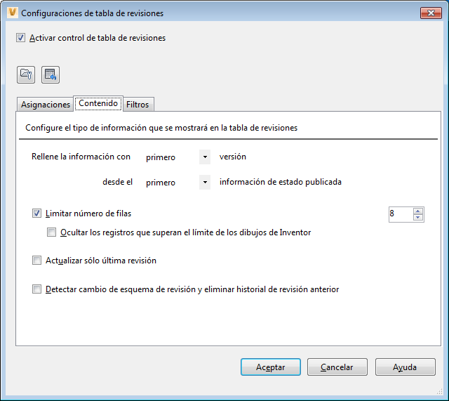 Tabla Contenido | En la ficha Contenido, se puede forzar el tipo de información que se mostrará en la tabla de revisiones. ![]() |