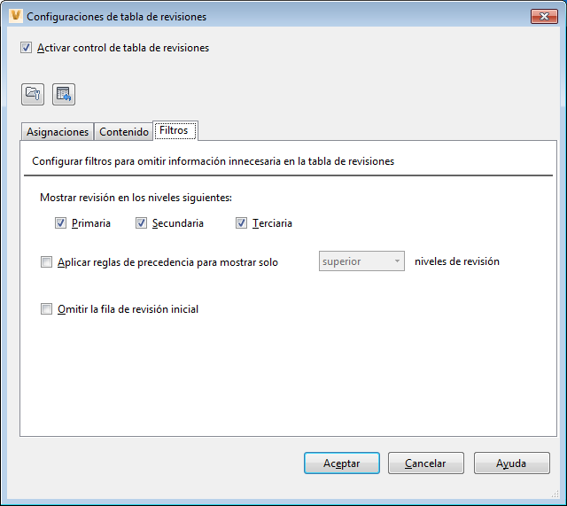 En el cuadro de diálogo Configuración de la tabla de revisiones, seleccione la ficha Filtros.