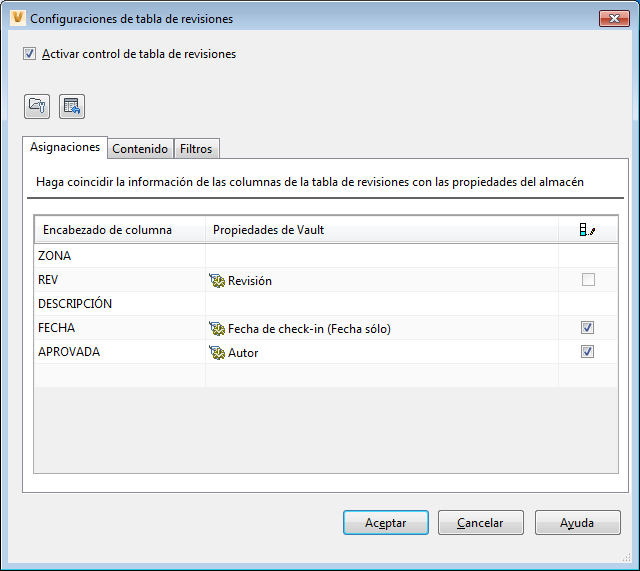 Ficha asignaciones | En la ficha Asignaciones, se pueden asignar propiedades de Vault a las columnas de la tabla de revisiones. ![]() |