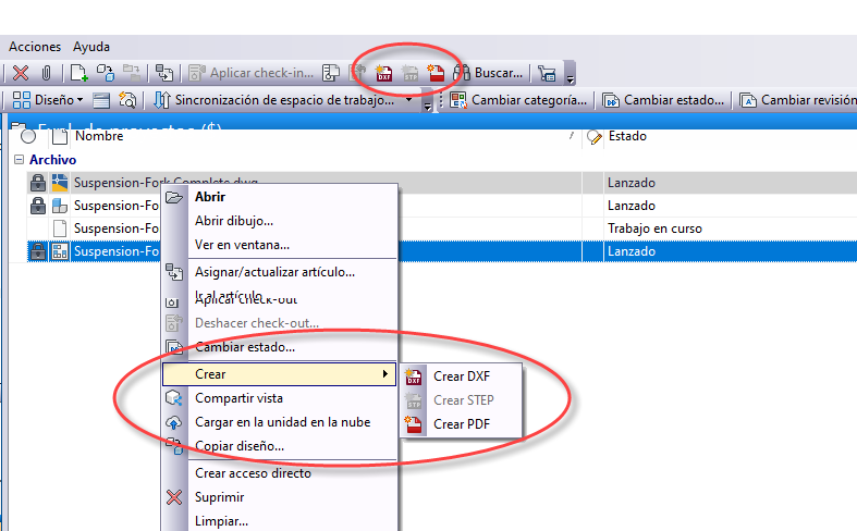 Importante: Los comandos Crear DXF, Crear PDF y Crear STEP solo están disponibles para la versión más reciente del archivo y no para ninguna versión o revisión histórica de los archivos CAD.
