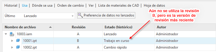 Veamos un ejemplo sencillo en el que el ensamblaje se encuentra en la revisión A y la pieza en la revisión B.