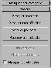 Affiche une boîte de dialogue permettant de masquer les objets que vous sélectionnez. Reportez-vous à la rubrique Sélectionner dans la scène, qui décrit des commandes quasiment identiques.
