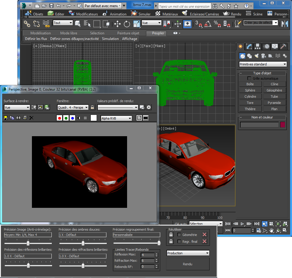 Fenêtre principale 3ds Max, avec une barre d'outils ancrée et disposition des fenêtres affichant plusieurs vues.