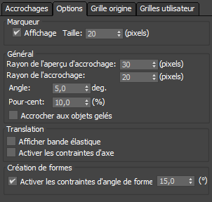 Le groupe de fonctions Options de la boîte de dialogue Paramètres de grille et d'accrochage vous permet de définir les options d'accrochage.