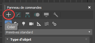 Le groupe de fonctions Créer regroupe les objets que vous créez en sept catégories. Chaque catégorie dispose de son propre bouton. Chaque catégorie affiche plusieurs sous-catégories d'objets. Une liste déroulante permet de choisir parmi les sous-catégories d'objets et chaque type d'objet dispose de son propre bouton sur lequel vous cliquez pour commencer la création.