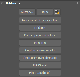 Les utilitaires de 3ds Max sont fournis sous forme de plug-ins. 3ds Max est fourni avec les utilitaires répertoriés ci-dessous. Certains utilitaires sont disponibles auprès de développeurs tiers. Par conséquent, il se peut que votre installation 3ds Max comprenne des utilitaires non décrits ici. Choisissez Aide