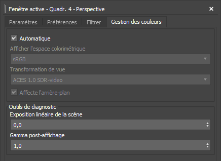 - Utilise les paramètres enregistrés dans les préférences de gestion des couleurs de la scène. Désactivez cette option pour modifier les options d’une fenêtre spécifique.