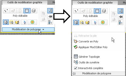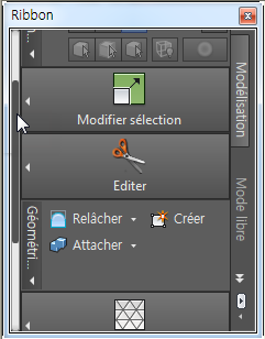 Dans ce mode, des commandes supplémentaires sont disponibles dans l'extension de certains groupes de fonctions. Elles sont indiquées par une petite pointe de flèche située en regard des titres des groupes de fonctions, lorsque ceux-ci sont développés. Cliquez sur le titre pour ouvrir l'extension.