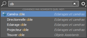 Lorsque vous entrez le texte à rechercher, la liste déroulante qui s'ouvre dans la boîte de dialogue de recherche affiche les actions correspondantes. Pour sélectionner une action, cliquez sur son nom. Pour effacer le contenu du champ de recherche, cliquez sur la croix située à l’extrémité droite de la zone de recherche. Pour quitter la recherche, choisissez une commande, cliquez en dehors de l’interface de recherche ou appuyez sur la touche Échap. Pour en savoir plus, reportez-vous à la rubrique Recherche dans 3ds Max.