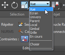 - La liste déroulante Système de coordonnées de référence , qui contrôle l'orientation des axes de transformation, se trouve à droite des boutons Déplacement, Rotation et Mise à l'échelle sur la barre d'outils principale.