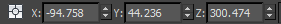 Affichent et acceptent la saisie des valeurs absolues de position, de rotation et d’échelle le long des trois axes. La position et la rotation sont généralement affichées en unités Univers, mais cela dépend du système de coordonnées de référence actif. L’échelle s’affiche toujours en unités locales.