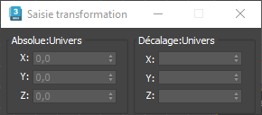 Par exemple, si la transformation Déplacement est active, les champs de la boîte de dialogue affichent les positions absolue et de décalage de l'objet sélectionné dans l'espace univers. Si aucun objet n’est sélectionné, les champs deviennent grisés.