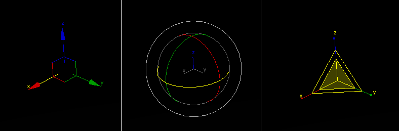 De gauche à droite : gizmo de déplacement, gizmo de rotation et gizmo d'échelle