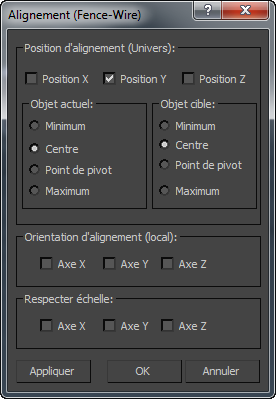 3ds Max ouvre la boîte de dialogue Alignement. Au besoin, déplacez-la de manière à voir la fenêtre active.