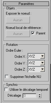 Ces paramètres vous permettent de spécifier le noeud exposé, un objet de référence autre que le parent, ainsi que des paramètres de rotation et de synchronisation.