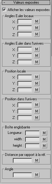 Ce panneau déroulant fournit des indicateurs de toutes les valeurs de transformation de l'objet Exposer le noeud. Un bouton intitulé M apparaît en regard chaque valeur. Cliquez sur ce bouton pour copier le MAXScript associé à la valeur dans le presse-papiers; vous pouvez ensuite le coller dans un script.
