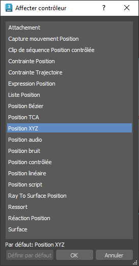 - Faites votre choix dans la liste de contrôleurs disponibles. La boîte de dialogue Affecter contrôleur affiche un sous-ensemble des différents types de contrôleurs dont les membres varient selon le type de piste que vous avez mis en surbrillance. Par exemple, les contrôleurs Rotation sont disponibles uniquement pour les pistes de rotation.