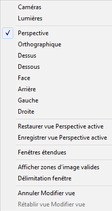 Si la scène contient des caméras, elles sont répertoriées dans ce sous-menu. Si aucune caméra n'existe, le sous-menu ne s'ouvre pas. La sélection d'un nom de caméra modifie la fenêtre en point de vue de caméra.