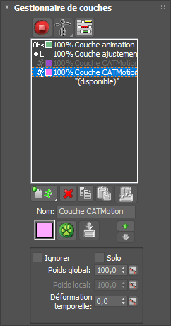 Le système de couches de CAT est un simple mécanisme de stockage et de gestion des contrôleurs d'animation. Il prend en charge tous les contrôleurs d'animation de 3ds Max, y compris les différents contrôleurs d'images clés tels que Bézier, TCA, Linéaire Quaternion et Euler, ainsi que les contrôleurs procéduraux comme les contrôleurs de scripts, d'expressions et de contraintes.