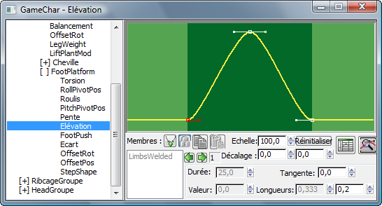 Tous les contrôleurs, à l'exception de RotDécal et de PosDécal, sont dotés de graphiques permettant d'afficher la courbe de mouvement du contrôleur sélectionné dans le cycle de mouvement.