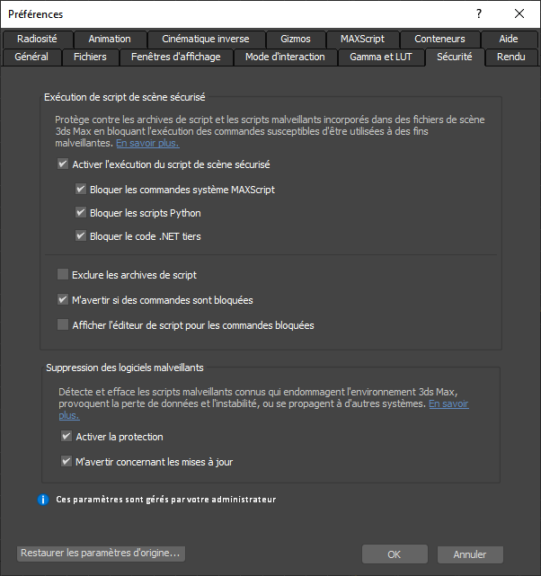 Dans le groupe de fonctions Sécurité de la boîte de dialogue Paramètres des préférences, vous pouvez définir des options pour l’exécution de script de scène sécurisé.
