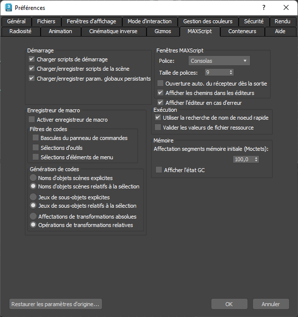 Vous pouvez également changer ces paramètres en modifiant la section [MAXScript] du fichier 3dsmax.ini.