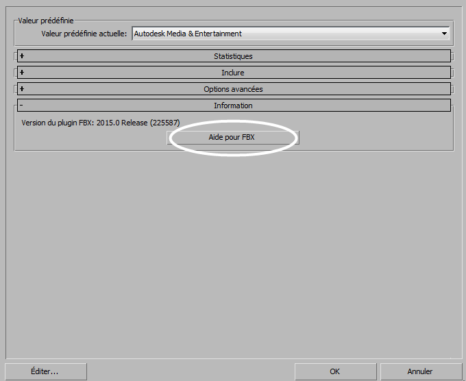 Pour accéder à la documentation du 3ds Max FBX plug-in, cliquez sur le bouton Aide pour FBX dans le panneau déroulant d’informations.