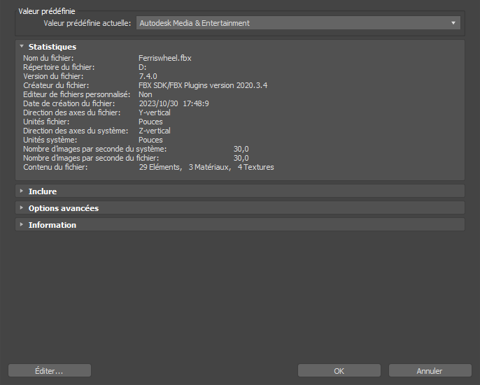 Fenêtre d'importation FBX