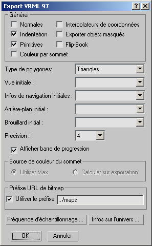 Exporte des primitives VRML97, ce qui réduit la taille du fichier car leur description est très simple (une sphère, par exemple, est décrite par son rayon). Pour connaître le nombre de polygones contenus dans la scène, désélectionnez cette case afin d'exporter des primitives 3ds Max qui comportent un ensemble indexé de faces pour chaque objet. Valeur par défaut : activé.