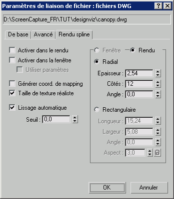 Le groupe de fonctions Rendu spline de la boîte de dialogue Options d'importation vous permet de définir le mode d'affichage des objets importés à partir de fichiers DWG et DXF, ainsi que la manière dont ils sont traités par l'outil de rendu de 3ds Max.