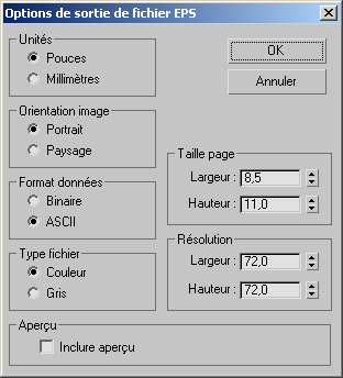 PostScript est un langage de description de page conçu par Adobe pour le codage des images graphiques. Il est pris en charge par de nombreux appareils d'impression et son utilisation est largement répandue dans les domaines de la mise en page et de la conception graphique, car il permet le portage d'images d'une plate-forme à une autre. Vous ne pouvez pas visualiser les fichiers PostScript avec 3ds Max ni les utiliser comme bitmaps dans des matériaux ou des environnements.