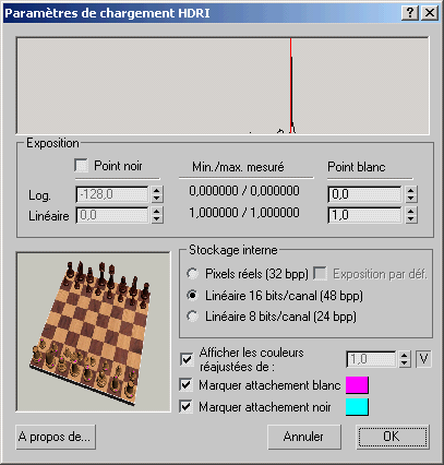 L'intervalle de luminance d'une image est utilisé uniquement lorsque la valeur linéaire du point blanc est définie au-dessus de 1,0. En d'autres termes, lorsque le point blanc est défini sur ou en-dessous d'une valeur linéaire de 1,0, aucune propriété de luminance spéciale de l'image HDR n'est utilisée et ne donnera de résultats similaires à ceux des autres formats bitmaps tels que TIG et JPG.