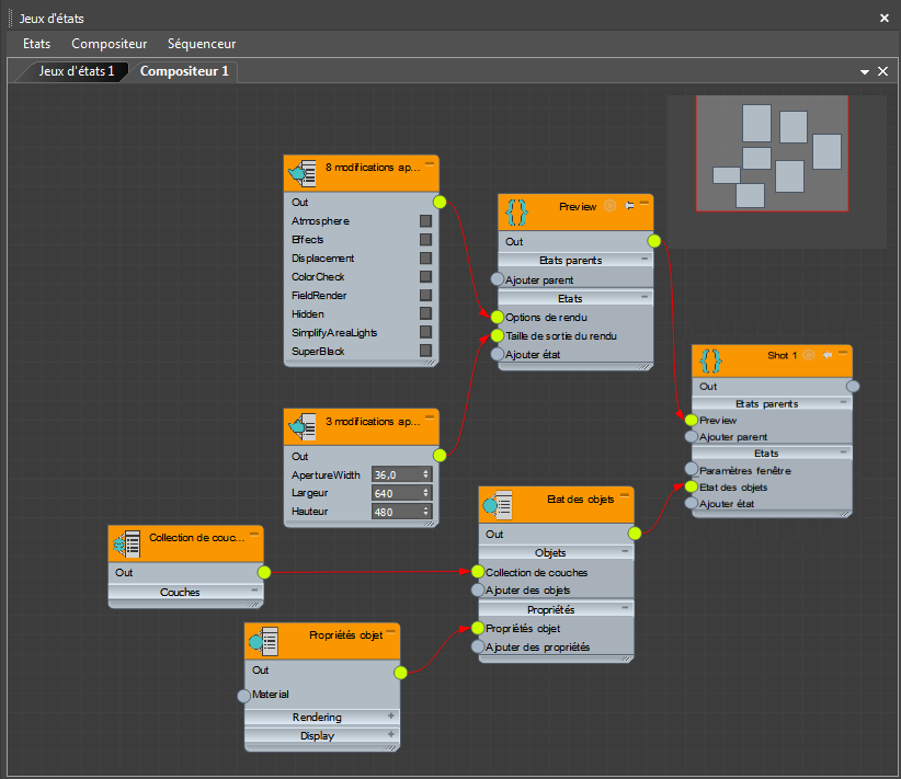 La vue Compositeur est un groupe de fonctions dans l'interface Jeux d'états qui affiche un schéma des états qui peuvent générer des rendus d'images (excluant l'état Objets). Vous pouvez par exemple reconnecter les composants, corriger les couleurs, connecter des compositeurs externes tels qu'Adobe After Effects et plus encore.