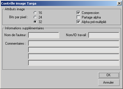 L'activation du bouton Rendu ou Configuration dans la boîte de dialogue Fichier sortie rendu permet d'accéder à la boîte de dialogue Contrôle image Targa.