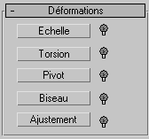 Les courbes de déformation sont accessibles dans le panneau déroulant Déformations du groupe de fonctions Modifier. Ce dernier ne peut pas être utilisé tant que vous vous trouvez dans le groupe de fonctions Créer. Pour accéder au panneau déroulant Déformations, vous devez ouvrir le groupe de fonctions Modifier après avoir réalisé l'extrusion. Les fonctionnalités offertes sur le panneau déroulant Déformations sont alors les suivantes :