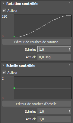 Ces fonctionnalités offrent la possibilité de spécifier la rotation et l'échelle de l'objet déformé le long de la trajectoire de la spline.