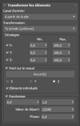 Cet opérateur requiert une sélection des sommets existants avant d'affecter n'importe quel élément dans le maillage. Lorsque l'opérateur Transformer les éléments semble inactif, cela signifie généralement qu'aucune sélection n'est disponible pour traitement. Vous pouvez fournir une sélection de sommets avec une sélection adoucie manuelle (par exemple, à l'aide d'Editer poly) ou via la pile des opérateurs (par exemple, à l'aide d'un opérateur d'influence du noeud).