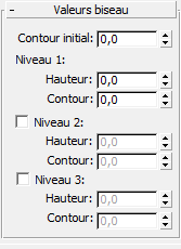 Le panneau déroulant Valeurs biseau contient des paramètres qui permettent de définir la hauteur et le degré de biseautage sur un maximum de quatre niveaux.