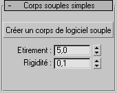 Les animations de type drapé d'un tissu fonctionnent en général mieux avec une valeur d'étirement élevée et une valeur de rigidité faible. Pour les corps souples, vous préférerez en général les valeurs d'étirement et de rigidité élevées, selon le degré de " mollesse " souhaité pour l'objet.