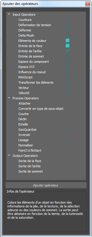Utilisez la boîte de dialogue Ajouter des opérateurs pour ajouter des opérateurs d’entrée, de processus et de sortie à la pile.