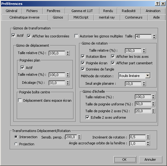 Gizmos et vérifiez que vos paramètres correspondent aux paramètres par défaut indiqués ci-après. Le plus important est Gizmos de transformation