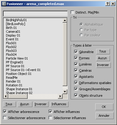 Si vous pouvez accéder à la boîte de dialogue Fusionner, utilisez-la pour afficher la liste des composants de la scène. Vous pourrez localiser plus facilement l’objet corrompu à l’origine de l’échec de chargement. Une fois que vous avez trouvé l’objet corrompu, excluez-le du fichier et réenregistrez le fichier.