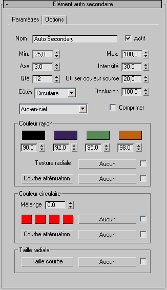 Permet de mélanger des couleurs définies dans Couleur rayon à celles définies dans Couleur circulaire. Si le champ à double flèche est défini sur 0, seules les valeurs définies dans Couleur rayon seront utilisées. S’il est défini sur 100, seules les valeurs définies dans Couleur circulaire seront utilisées. Toute valeur comprise entre 0 et 100 produit un mélange des deux valeurs.
