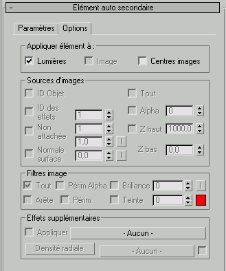 Les éclats d'objectif secondaires (onglet Sec. A) correspondent aux cercles de petite taille que vous voyez en règle générale sortir de la source de l'éclat, le long d'un axe relatif à la position de la caméra. Ils sont provoqués par la réfraction de la lumière sur les différents éléments de l'objectif de la caméra. Les éclats secondaires se déplacent en fonction des changements de position de la caméra par rapport à l'objet source.