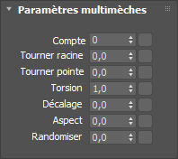 La frisure à basses fréquences produit naturellement un certain degré de regroupement, mais les paramètres multimèches permettent de l'ajuster. Pour chaque cheveu faisant l'objet d'un rendu normal, la fonction Multimèches crée un groupe supplémentaire réparti autour de l'objet source. Les paramètres Tourner racine et Tourner pointe définissent le degré de répartition aux racines et aux pointes et Qté multimèches définit la quantité de cheveux à créer pour le groupe. Les deux premiers paramètres permettent de mettre en forme le groupe en étendant ou comprimant les racines et les pointes.
