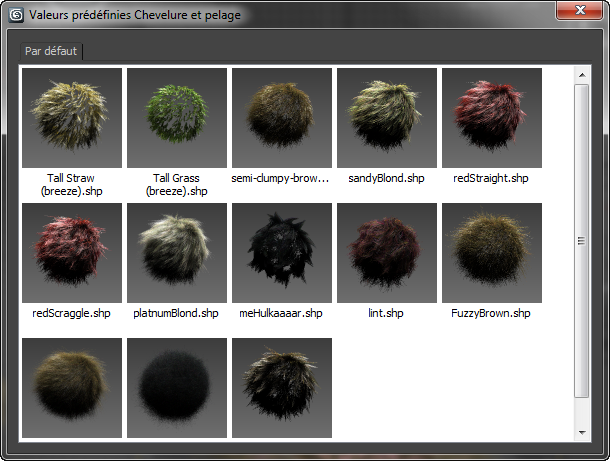 Ouvre la boîte de dialogue des valeurs prédéfinies de la chevelure/du pelage, qui contient une liste de ces valeurs sous forme d'échantillons nommés. Pour charger un jeu de valeurs, cliquez deux fois sur son échantillon. Plusieurs valeurs prédéfinies sont fournies avec 3ds Max.