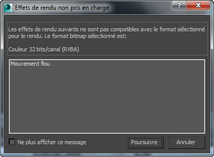 La plupart des effets de rendus d'image dans 3ds Max ne sont pas compatibles avec la sortie en virgule flottante 32 bits. Lorsque vous effectuez un rendu à l'aide d'un ou de plusieurs effets non pris en charge, la boîte de dialogue suivante apparaît :