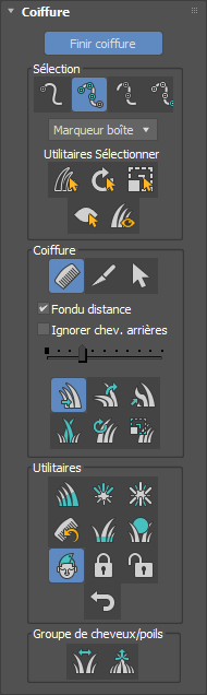 Cliquez sur Coiffer pour démarrer la coiffure. Cliquez sur Finir coiffure pour désactiver le mode coiffure. Lorsque vous activez ce bouton, un pinceau est immédiatement disponible et l'outil actif par défaut est Translation. L'activation de l'option Coiffer vous permet d'accéder au niveau de sous-objet Guides du panneau déroulant Sélection et de sélectionner tous les guides.